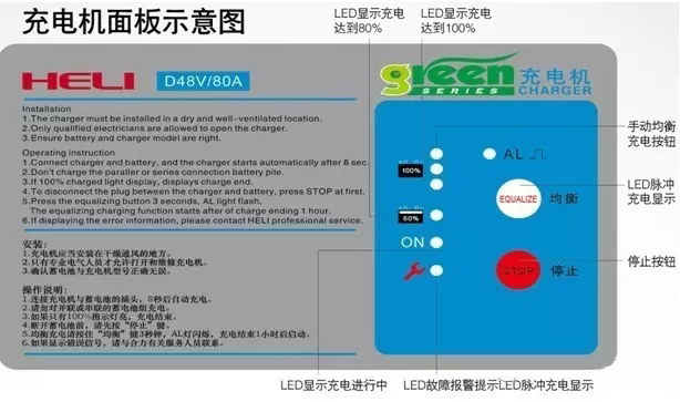4.充電時間大約8-10小時,充滿電后100%LED燈顯示。在斷開蓄電池插頭前,先按下stop停止按鈕切斷充電程序。檢查電瓶液位是否在規(guī)定位置,不滿則補充蒸餾水到規(guī)定液位。注意:檢查前釋放身體的靜電;